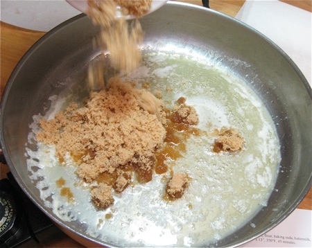 Melt 1/4 cup butter in the skillet, and sprinkle with 3/4 cup brown sugar.
