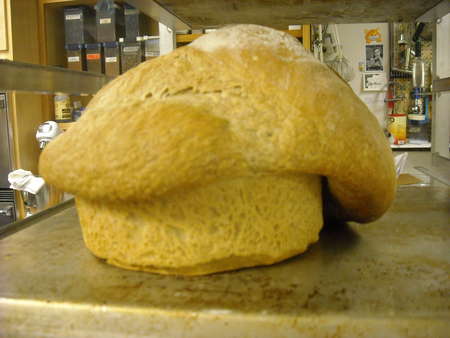 Didn’t grease the pan? Nylon spreaders are a big help here. Also offset spatulas. You need something flexible, yet rigid, to run down the side of the pan next to the baked good to free it up. If the pan is nonstick, stay away from metal utensils. This bread was a bit of a challenge to extract from the pan; not that anyone was lining up to eat it (kinda looks like "elephant" bread, eh?). The nylon spreaders did the trick.