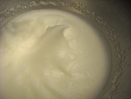 When you whip egg whites, they go through these stages. First they get foamy, which looks like this: