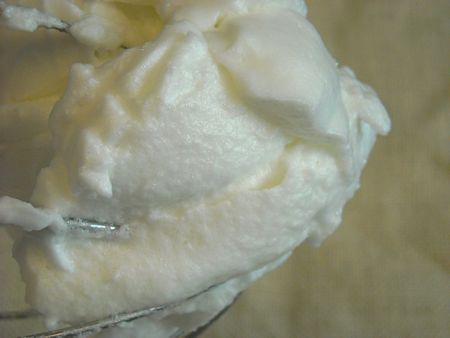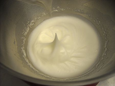 See how the top of the point flops over? Another minute of beating at high speed, and the whites get to stiff peaks. That's where they stand straight up:
