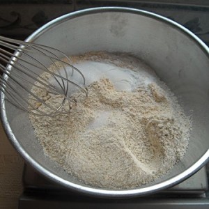 I write a lot of recipes that ask you to whisk together the dry ingredients. I've developed the habit of measuring the flour first, then adding baking powder, baking soda, salt, and spices in recognizable blobs on top. This way, if I get distracted, I can count the smaller piles in the bowl and see what I've added and what I haven't.