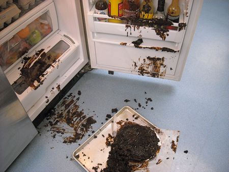 I think a lot of mistakes happen when we're overloaded, under time pressure, or get distracted. If the mess is bad enough, sometimes all you can do is just laugh. That's what happened when I was trying to get a chocolate cake cooled and frosted faster than those aforementioned laws of physics really allowed. Gravity in particular can be unforgiving.