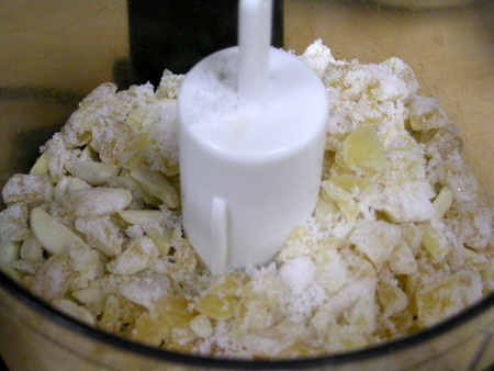 To save time and dishes you can grind the crystallized ginger and nuts together in a food processor. The nuts will also keep the ginger from becoming too sticky to work with.