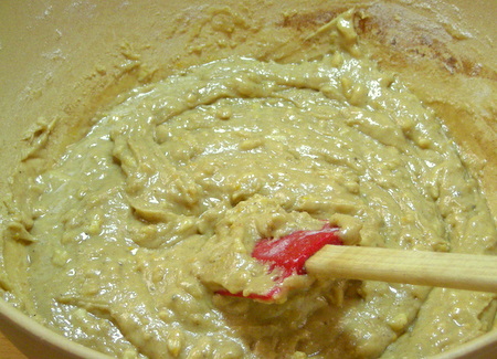 Combine the flour, spices, nuts, and ginger with the honey mixture. If you're using candied diced peel instead of grated peel, it would be added now as well.