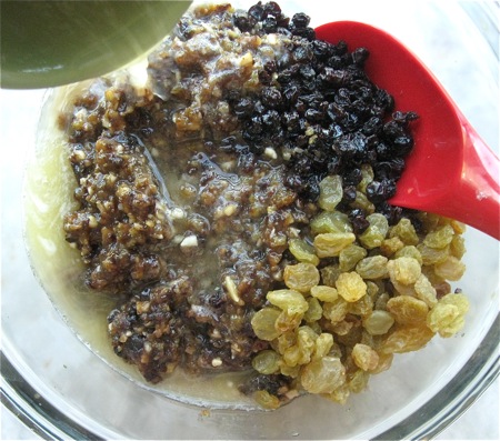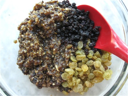 Transfer the mixture to a bowl. Add a scant 1/2 cup (67g) golden raisins, and 1/3 cup (43g) currants.