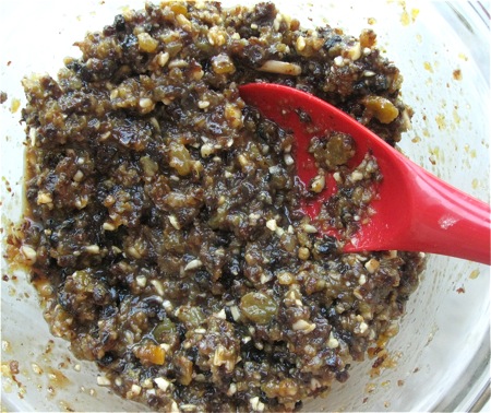 No, not THAT mincemeat. British Christmas mince is FRUIT mince. Made from raisins and currants, apples and nuts, sweetened with brown sugar and taken over the top with a generous splash of brandy, fruit mince is nicely spicy, full-flavored, and the perfect filling for tiny, two-bite tarts.