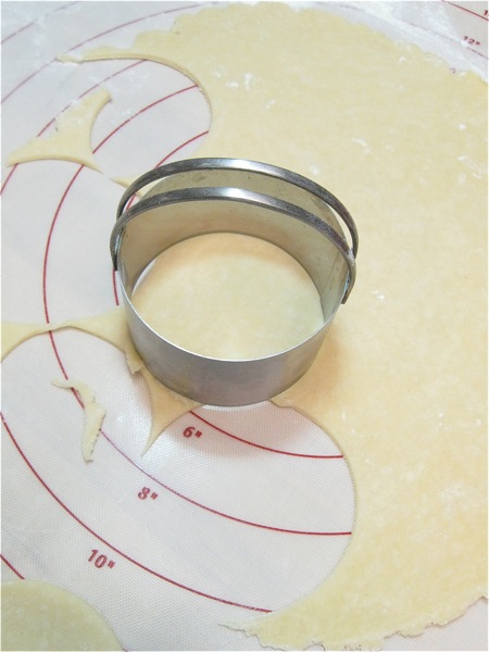 Cut rounds of dough - 24 for a mini muffin pan, 12 for a standard muffin pan. A 2 1/4" biscuit cutter works well for the mini tarts. Save any scraps for the stars that'll go on top. (If you're making small (rather than mini) tarts, a 3 3/4" English muffin ring is close enough.)
