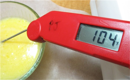 Set the mixture aside to allow the butter to melt, and for it to cool to lukewarm, 30 to 35 minutes. You can reduce the milk's cooling time by about 10 minutes by refrigerating it.