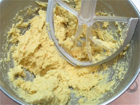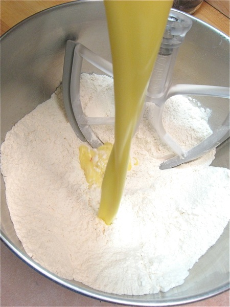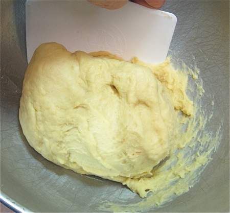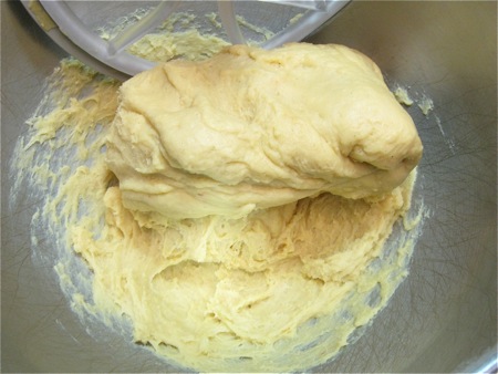 Knead for about 7 minutes by mixer, about 10 minutes by hand, until the dough is smooth and supple. It'll remain fairly sticky; that's OK. The dough above has been kneaded for about 4 minutes.