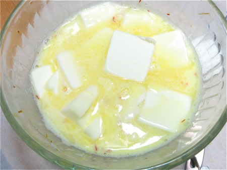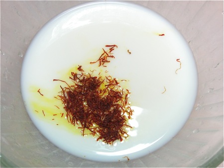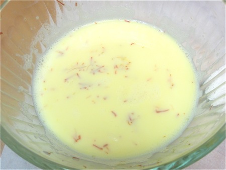 In a small saucepan set over medium heat (or easier, in the microwave), heat 1 cup (227g) milk and the saffron to a simmer.