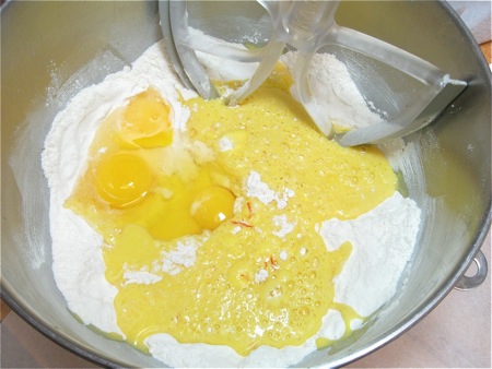 Add the 2 large whole eggs, and 1 large egg yolk; reserve the white for later.