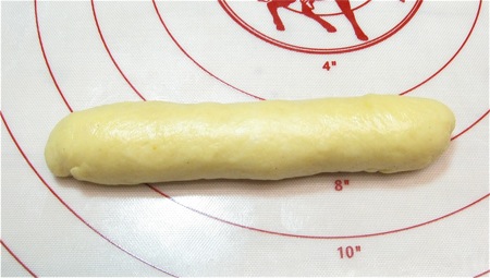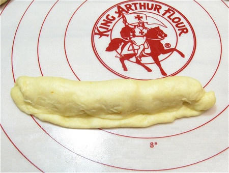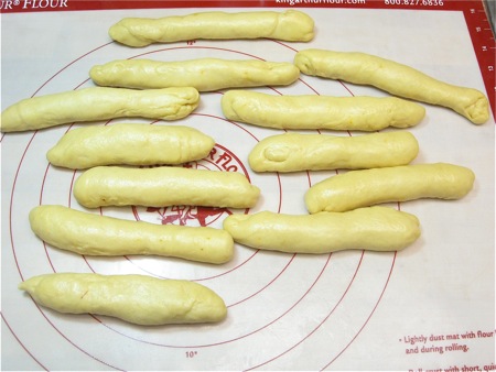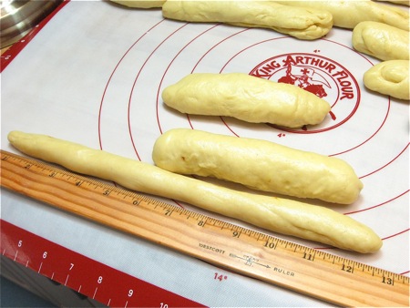 Shape the pieces of dough into rough logs; you can see the ones in the front have been shaped. Let them rest, covered, for about 10 minutes; this gives the gluten a chance to relax.