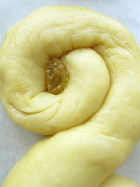 Tuck a golden raisin into the center of each of the two side-by-side coils, if desired.