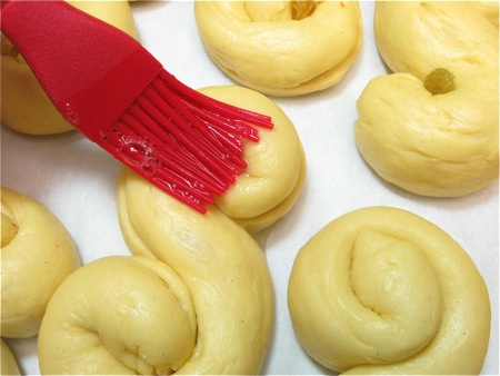 Mix the reserved egg white with 1 tablespoon cold water, and brush on the buns.