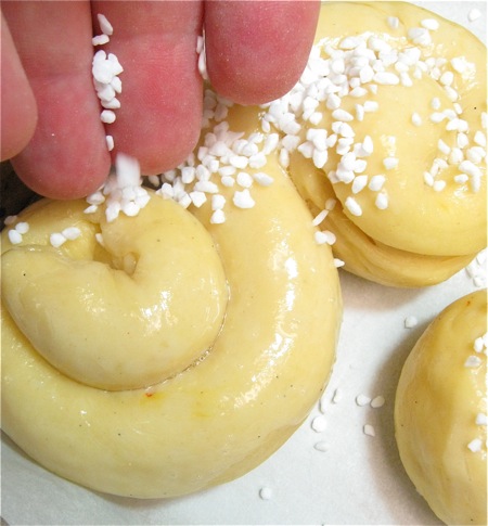 Here's a nice crowning touch for these Scandinavian buns: Swedish pearl sugar, a bright white, coarse sugar that doesn't melt in the oven.