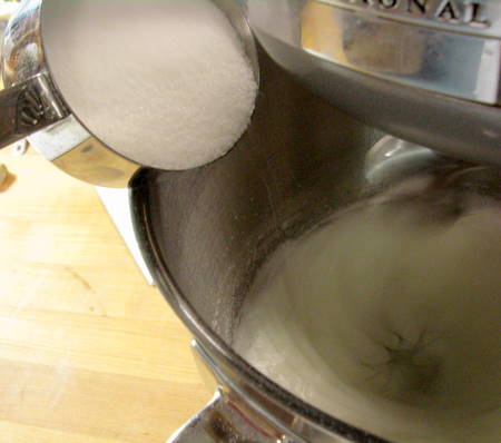 With the mixer running on medium speed, slowly add the sugar. Increase the speed to high.