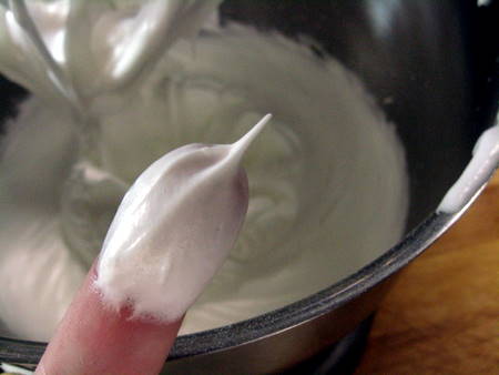 Continue to whip the egg whites until they'll hold a stiff peak. The whites should still be glossy looking, not dry or clumpy.