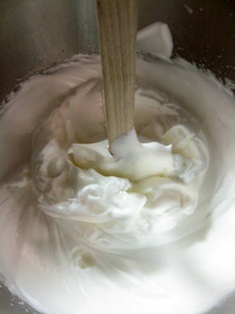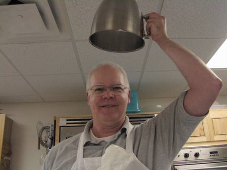 Frank showed me the way he learned to judge if the whites were sufficiently whipped. His teacher, Sister Audrey, taught him that if you could hold the bowl of whites over your head and say a full Hail Mary, they were just right. And YES, the bowl really is full of whites. I was short on faith, so snapped the picture quickly, but the whites held just fine.