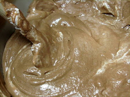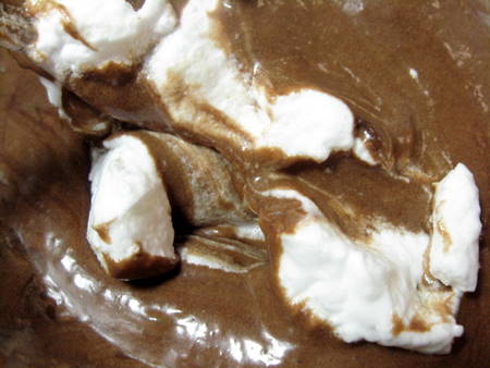 In two stages add the rest of the whites. Fold gently using a wide spatula, turning your bowl a bit after each fold. Stop when you see just small streaks of white left in the batter.