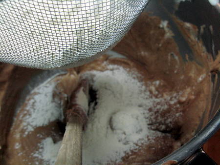Sift the dry ingredients over the surface of the batter and fold them in gently. The batter will deflate just the tiniest bit. Stop as soon as most of the flour is incorporated into the batter; it's best not to over-mix and risk deflating the batter.
