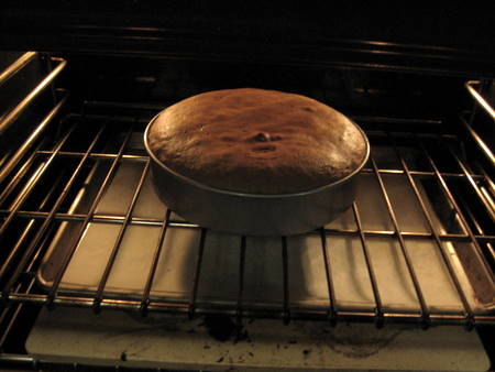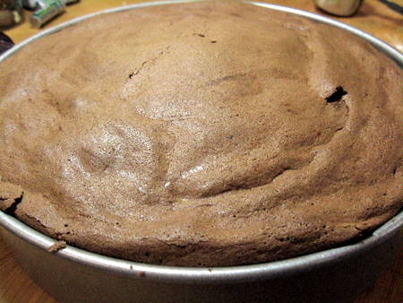 Bake until the cake is light, puffy, and a cake tester tests clean when inserted into the center of the cake. There'll be a thin crust on top of the cake. Frank calls this a sugar crust, and it can be sliced off or brushed off by hand to give a smooth top to the cake once it cools.