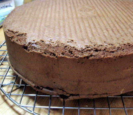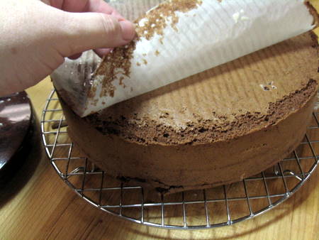 Immediately after baking run a nylon spreader or other thin-bladed knife around the inside edge of the cake pan to loosen the cake. Turn the cake out onto a wire rack. Peel off the parchment paper and allow the cake to cool completely.