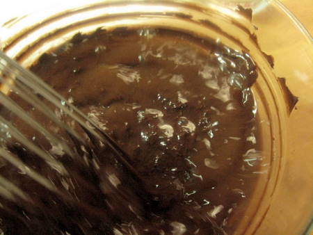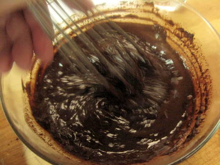 At first the water and chocolate won't seem to combine, but suddenly they'll blend together into a smooth liquid glaze. It's key to NOT stop whisking until this happens, though, or you may end up with a lump of chocolate in a pool of hot water.