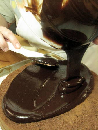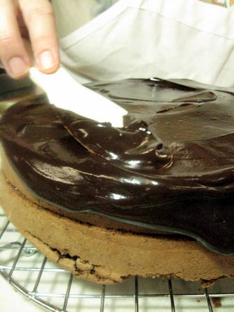 Place the filled cake on a wire rack over a parchment-lined baking sheet with a rim. This will raise the cake and provide a tray to catch the hot chocolate glaze as you pour it over the cake.