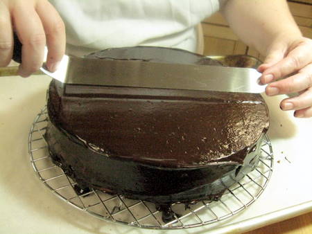 As the glaze begins to set you can use a long straight edge to smooth out the top of the cake. Allow the glaze to set up before you move the cake to its serving plate.