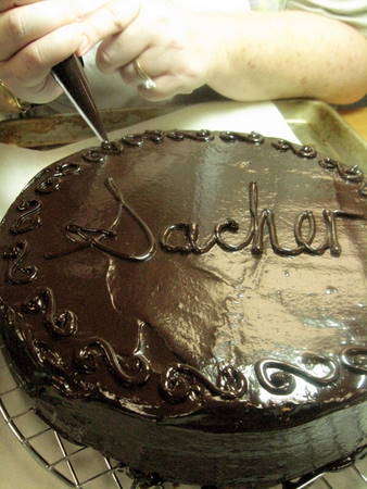 For a final elegant touch, you can use leftover glaze (or another batch) to pipe decorations on the cake. Traditionally, just the word Sacher is piped onto the cake, but you can definitely add your own personal touch.