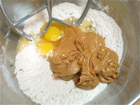 Add 2 large eggs and 1 cup (269g) peanut butter, crunchy or plain.