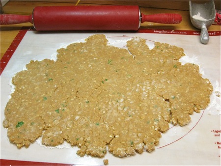 To cut out dog bone biscuits, roll the dough about 1/4” thick. No, it's not pretty; it'll develop cracks all over, and very ragged edges. No worries; trust me, your dog won't care about looks.