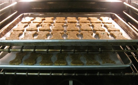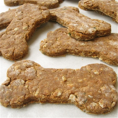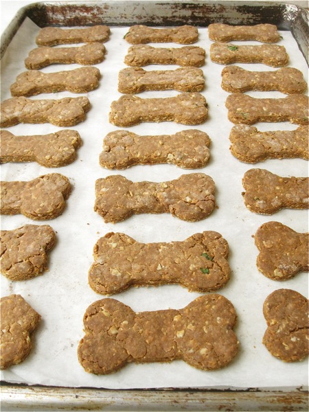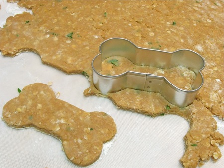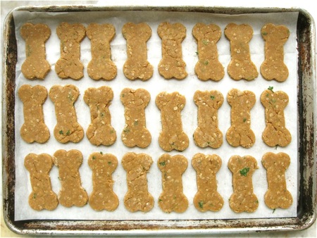 To make dog cookies, drop the dough in walnut-sized balls onto a lightly greased or parchment-lined baking sheet. Flatten to about 1/4” thick.