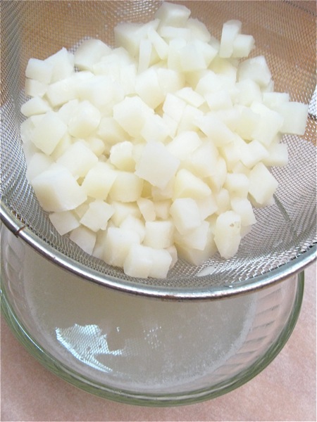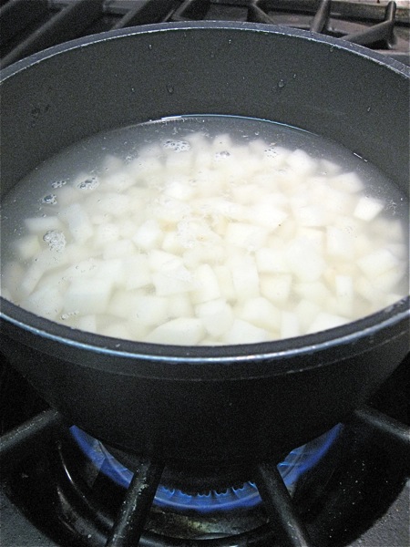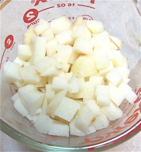 Let's start with the potato. Peel 1 large boiling potato (about 12 ounces), and cut it into 1/2" dice; you'll have about 2 cups (340g) of diced potato. Yukon Gold or Chef are both good potato choices.