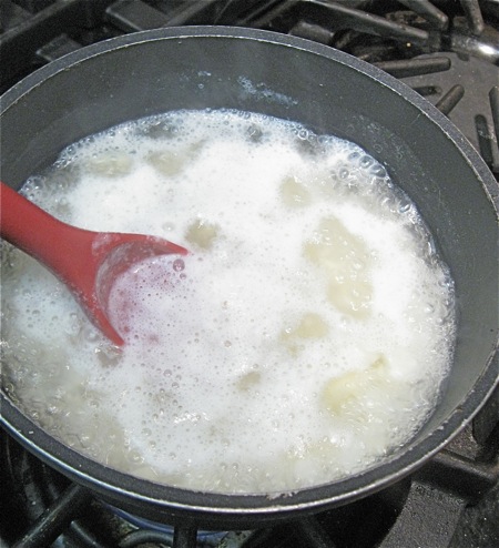 Pour in the reserved potato water.