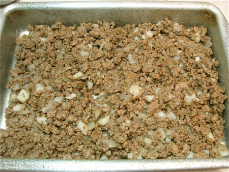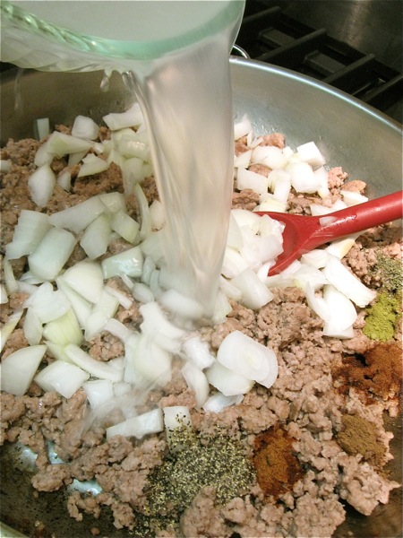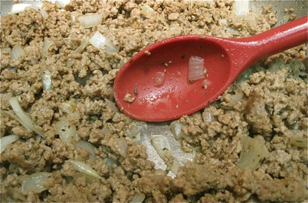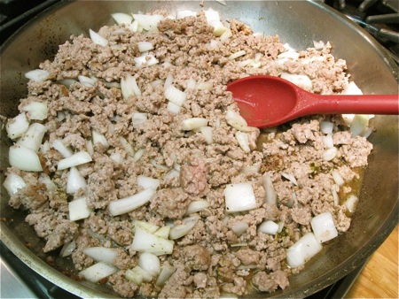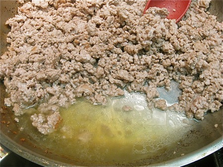 Next, brown the meat. Choose 2 pounds ground pork; or a combination of ground pork and ground beef; or meatloaf mixture.
