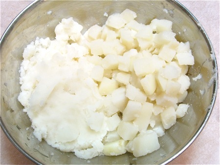 Add the mashed potatoes and diced potatoes, stirring to combine.