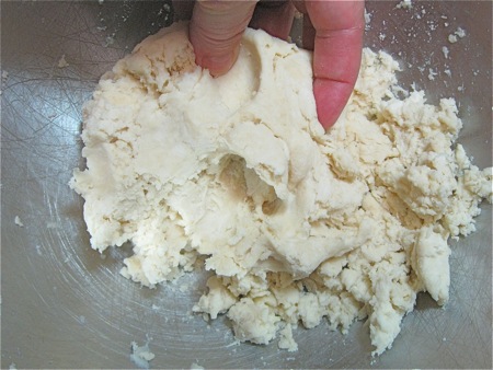 Grab the dough and press it with your fingers; it should feel supple and moist, not dry. You should be able to gather it into a ball that sticks together easily.