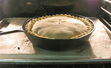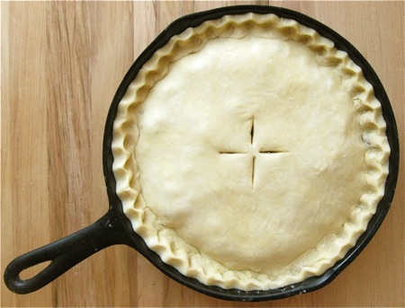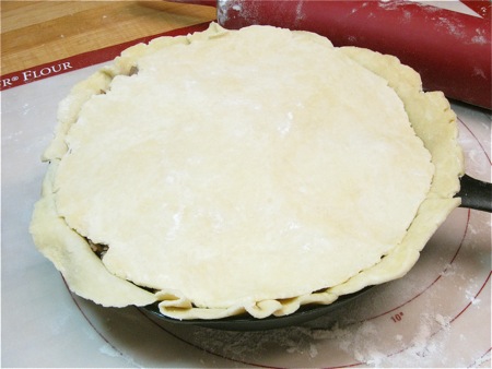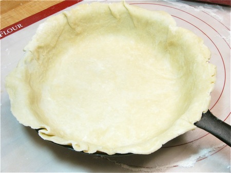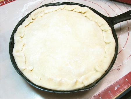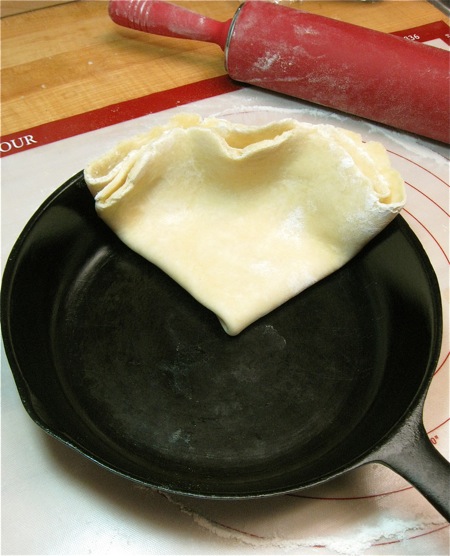 Before rolling, select your pan. A 9” cast iron skillet offers striking presentation at the table; but any 9” pie pan at least 1 1/4" deep is fine.