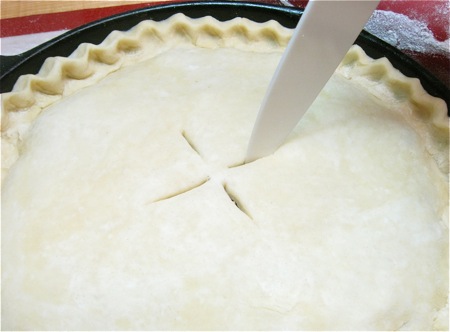 Cut a few vents in the top, to let the steam from the baking pie escape; this will keep the crust from ballooning up.
