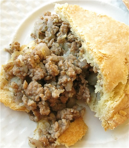 This is what happens when you serve tourtière hot from the oven; it simply won't hold its shape.