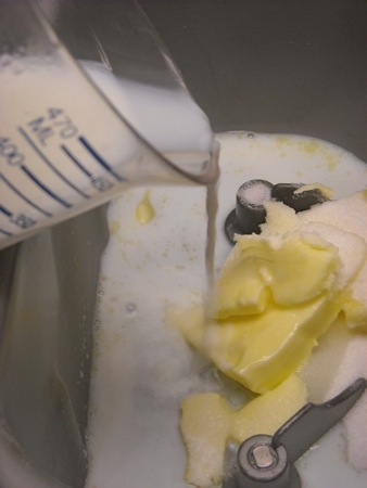 First, we scald some milk, then pour it over the butter and sugar. This melts the butter and dissolves the sugar.