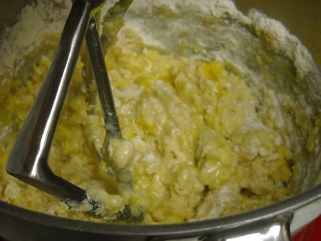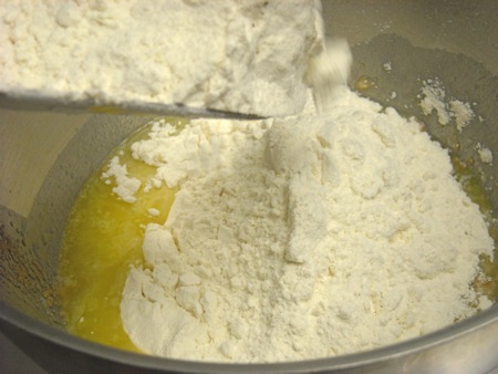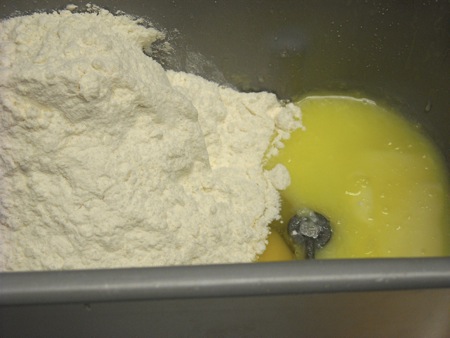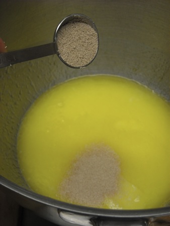 Next, the yeast is added, then the eggs, salt, and flour.
