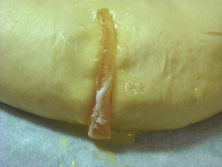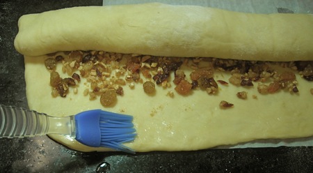 I'll spread the filling over the dough, leaving about half an inch of the long edges uncovered. If you're going to add a doll or a bean (I used a single macadamia nut; I like my inclusions to be edible) to the bread as tradition requires, this is the place to do it. Now roll up the dough (don't pull or wind it too tight; just flop it over on itself).