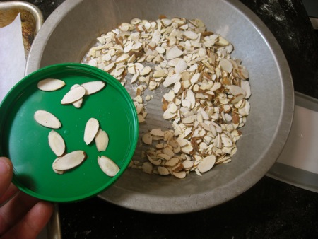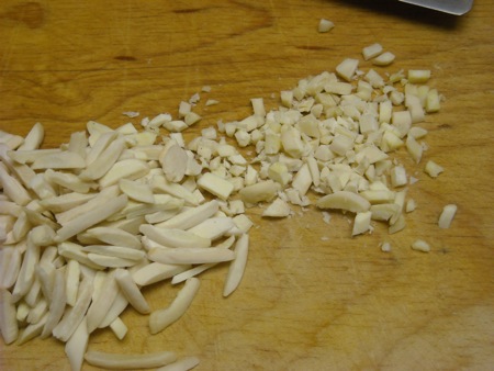 While the dough rises, I'll put the filling ingredients together. You can use any kind of nut you want in the filling, but since I plan to decorate with almonds, I'm going to put chopped almonds in the filling. I usually start with slivered ones, since they give me a head start on the chopping thing.