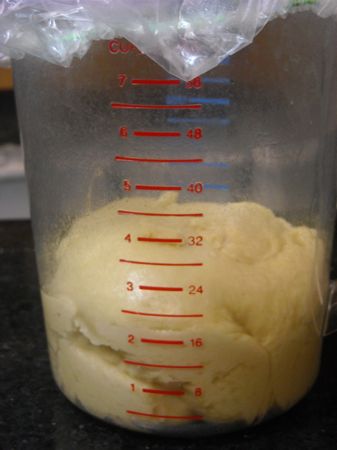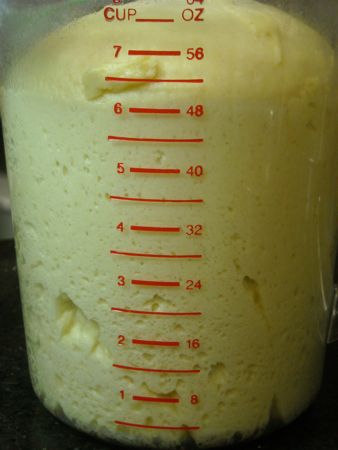 ...I put it in a greased measuring cup for its first rise. We find these big bad measuring cups to be extremely handy for this. You can see what's going on with the dough, and the marks tell you where the dough started and when it's doubled. If you need the reminder, you can always put a little piece of tape on the level of the container where the dough started.