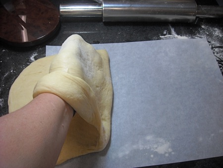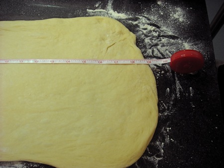 Ready to roll out. I greased the work surface and rolled the dough out into a long rectangle: 20” long by 10”. It's best to roll it partway, let it rest for a few minutes, then roll once more to its final dimensions. That way it shouldn't snap back when you're trying to get it bigger.