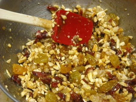 Combine the cinnamon, sugar, fruit, and nuts. I got ahead of myself and stirred the melted butter into the fruit instead of using it to brush the dough; either way works, so don't worry yourself on that score.