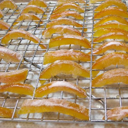 My first step is going to be to candy some orange peel. You can find a recipe for this in the Spring 2010 issue of The Baking Sheet. I've also put the recipe online. You can certainly use store-bought, but the flavor of what you make fresh is worth the effort, and you can make sure it's the shape and size you want.