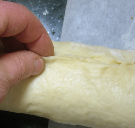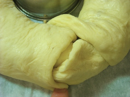 The next step is to complete the circle. Tuck one end inside the other (a little like a snake eating its tail), and pinch the dough together.